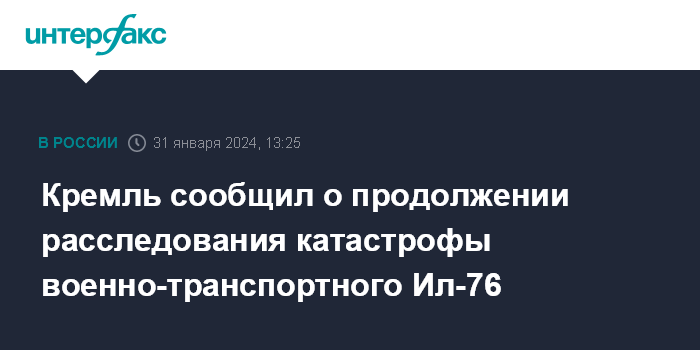 Москва. 31 января. INTERFAX.RU - Расследование катастрофы военно-транспортного Ил-76 в Белгородской области продолжается, заявил пресс-секретарь президента РФ Дмитрий Песков.