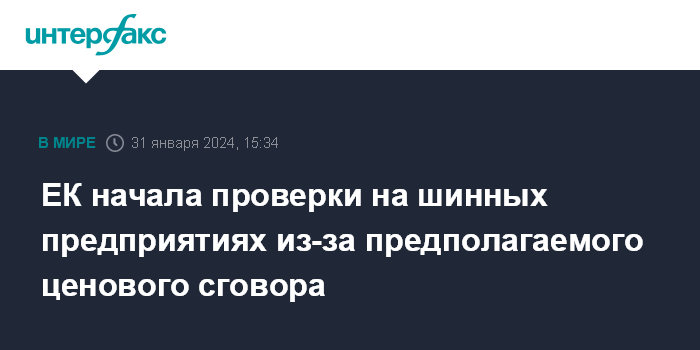 Москва. 31 января. INTERFAX.RU - Еврокомиссия (ЕК) проводит проверки на объектах европейских компаний-производителей шин из-за подозрений в нарушении ими запретов на картели и ограничительные деловые практики (ст. 101 договора о функционировании ЕС).