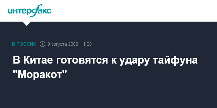 Лондон. 9 августа. INTERFAX.RU - Около миллиона человек были эвакуированы в прибрежной провинции на востоке Китая в связи с приближением мощного тайфуна "Моракот, сообщает в воскресенье британская телерадиокорпорация Би-Би-Си.
