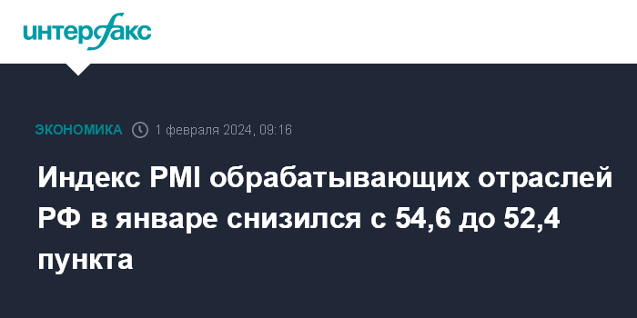 Москва. 1 февраля. INTERFAX.RU - Индекс PMI обрабатывающих отраслей РФ в январе 2024 года составил 52,4 пункта, опустившись с декабрьских 54,6 пункта, говорится в материалах исследования S&P Global.