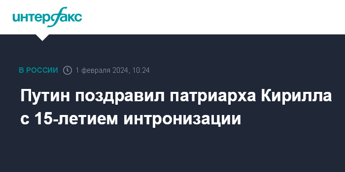 Москва. 1 февраля. INTERFAX.RU - Президент РФ Владимир Путин поздравил патриарха Московского и всея Руси Кирилла с 15-летием интронизации.