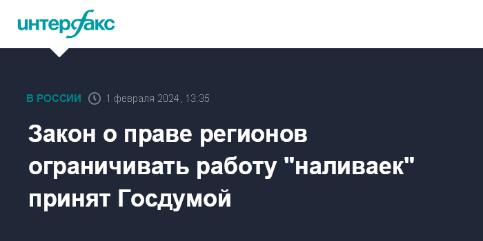 Москва. 1 февраля. INTERFAX.RU - Госдума в четверг приняла в третьем, окончательном, чтении закон о праве регионов ограничивать работу так называемых наливаек - мест розничной продажи алкоголя в многоквартирных домах.