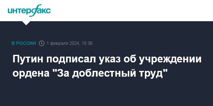 Москва. 1 февраля. INTERFAX.RU - Президент РФ Владимир Путин подписал указ об учреждении ордена "За доблестный труд".