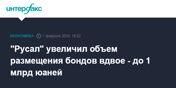 Москва. 1 февраля. INTERFAX.RU - МКПАО "ОК Русал" увеличило объем размещения облигаций серии БО-001Р-06 с не менее 500 млн до 1 млрд юаней, сообщил "Интерфаксу" источник на финансовом рынке.