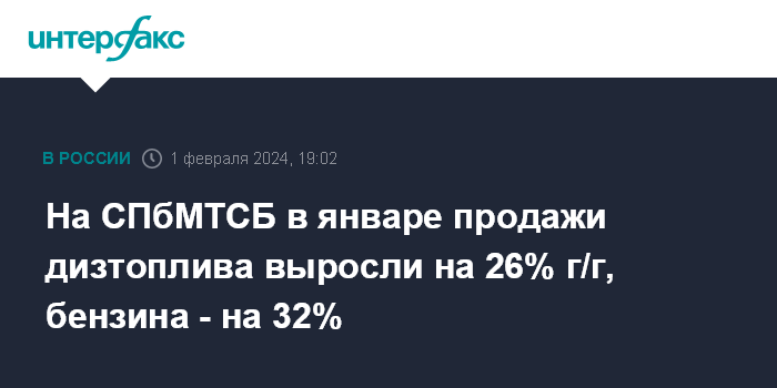 На СПбМТСБ в январе продажи дизтоплива выросли на 26% г/г, бензина - на 32%