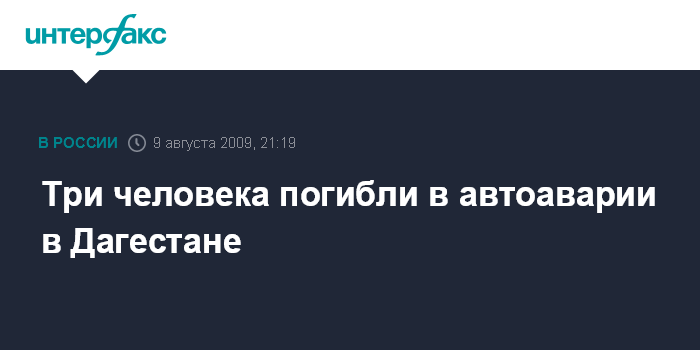 Махачкала. 9 августа. ИНТЕРФАКС-ЮГ - Три человека погибли, один госпитализирован в результате ДТП, произошедшей сегодня в Дагестане на федеральной трассе "Кавказ" в 5 км севернее города Избербаш, сообщил корреспонденту "Интерфакса" начальник пресс-службы МВД Дагестана Марк Толчинский.