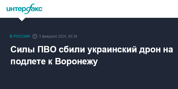 Москва. 3 февраля. INTERFAX.RU - Губернатор Воронежской области Александр Гусев сообщил, что в ночь на субботу в регионе средства противовоздушной обороны (ПВО) уничтожили дрон ВСУ.