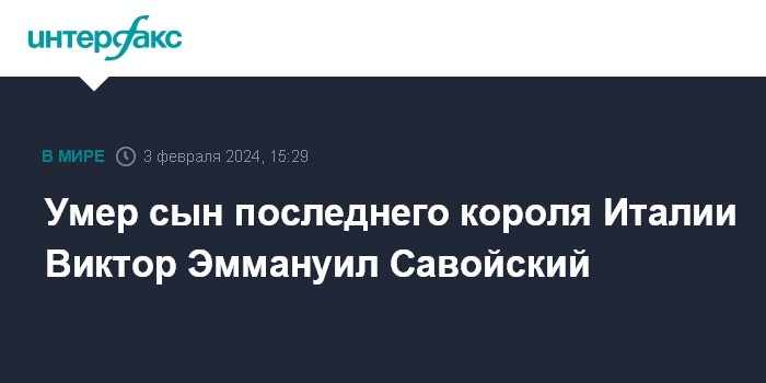"В 7:05 утра 3 февраля 2024 года его королевское высочество Виктор Эммануил, герцог Савойский, принц Неаполитанский скончался в Женеве в окружении членов его семьи", - цитирует газета Corriere della Sera текст заявления Савойского дома.