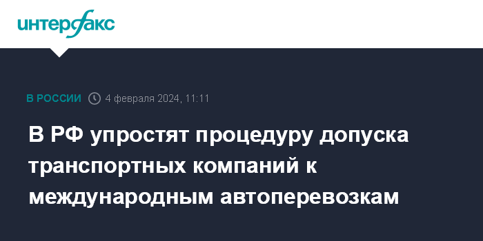 Москва. 4 февраля. INTERFAX.RU - С 1 сентября 2024 года срок предоставления госуслуги по допуску отечественных транспортных компаний к международным автоперевозкам сократится с 20 до 5 рабочих дней.