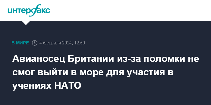 Москва. 4 февраля. INTERFAX.RU - Флагман британского флота авианосец HMS Queen Elizabeth в воскресенье не смог отправиться для участия в крупномасштабных натовских учениях Steadfast Defender 24, сообщил ВМФ Соединенного Королевства.