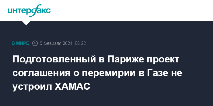Москва. 5 февраля. INTERFAX.RU - Движение ХАМАС не согласно с условиями соглашения о прекращении огня в секторе Газа, которое было выработано на переговорах в Париже. Оно не отвечает видению палестинского движения о прекращении войны и может позволить Израилю продолжать военные действия, сообщил телеканал "Аль-Маядин".