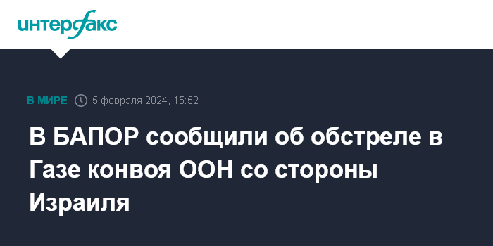 Москва. 5 февраля. INTERFAX.RU - Конвой ООН с продовольствием, который направлялся на север сектора Газы, подвергся обстрелу из артиллерии ВМС Израиля, сообщил в соцсети директор Ближневосточного агентства ООН для помощи палестинским беженцам (БАПОР) в Газе Томас Уайт.