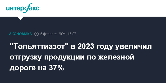 Москва. 5 февраля. INTERFAX.RU - "Тольяттиазот" (ТОАЗ) по итогам 2023 года увеличил объем отгрузки продукции железнодорожным транспортом на 37%, сообщает пресс-служба компании.