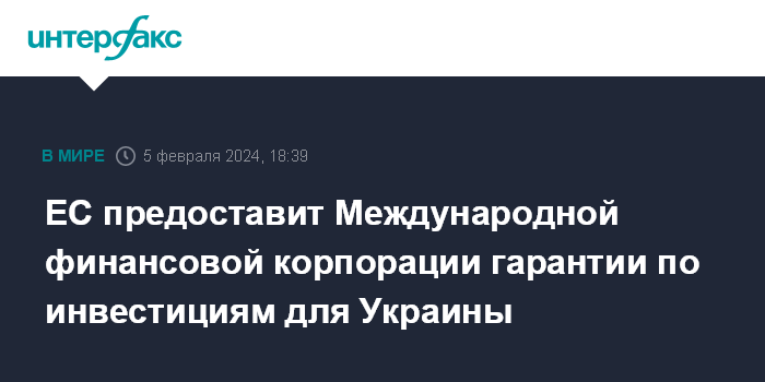 Москва. 5 февраля. INTERFAX.RU - Еврокомиссия объявила о подписании с Международной финансовой корпорацией (IFC) гарантийного соглашения по поддержке инвестиций для восстановления Украины.