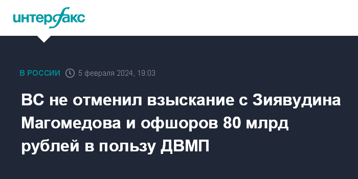 ВС не отменил взыскание с Зиявудина Магомедова и офшоров 80 млрд рублей в пользу ДВМП