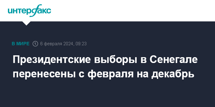Москва. 6 февраля. INTERFAX.RU - Парламент Сенегала принял решение отсрочить президентские выборы до 15 декабря, в то время как первоначально их планировалось провести 25 февраля, сообщает "Аль-Джазира".