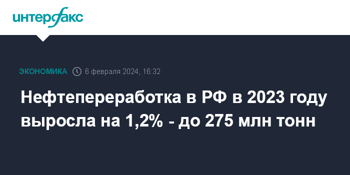 Москва. 6 февраля. INTERFAX.RU - Переработка нефти в РФ в 2023 году выросла по сравнению с 2022 годом на 1,2%, до 275 млн тонн, говорится в презентации вице-премьера Александра Новака, представленной в ходе "Открытого диалога" в Совете Федерации.