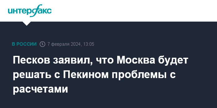 Песков заявил, что Москва будет решать с Пекином проблемы с расчетами