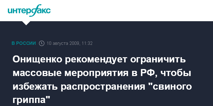 Москва. 10 августа. INTERFAX.RU - Глава Роспотребнадзора Геннадий Онищенко рекомендует главам регионов ограничить проведение массовых мероприятий, особенно в закрытых помещениях, в связи с угрозой распространения "свиного гриппа", говорится в постановлении главсанврача, опубликованном на сайте ведомства.