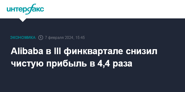 Москва. 7 февраля. INTERFAX.RU - Китайский интернет-гигант Alibaba Group Holding в третьем финансовом квартале в 4,4 раза сократил чистую прибыль и немного повысил выручку, при этом скорректированная прибыль оказалась хуже ожиданий аналитиков, а выручка совпала с прогнозами.