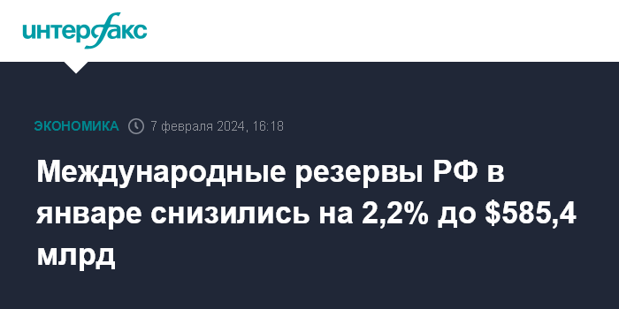 Москва. 7 февраля. INTERFAX.RU - Объем международных (золотовалютных) резервов РФ в январе 2024 года уменьшился на $13,144 млрд, или на 2,2%, до $585,448 млрд с $598,592 млрд, следует из информации на сайте ЦБ РФ.