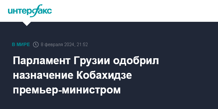Москва. 8 февраля. INTERFAX.RU - Премьер-министром Грузии стал Ираклий Кобахидзе, парламент объявил ему и новому правительству вотум доверия.