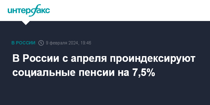 "В 2024 году индексация социальных пенсий составит 7,5%. Размер индексации социальных пенсий ежегодно утверждается правительством по темпу роста прожиточного минимума пенсионера в России за прошедший год, - говорится в сообщении. - Увеличение социальных пенсий и выплат по государственному пенсионному обеспечению позволит повысить выплаты для 4,1 млн человек".
