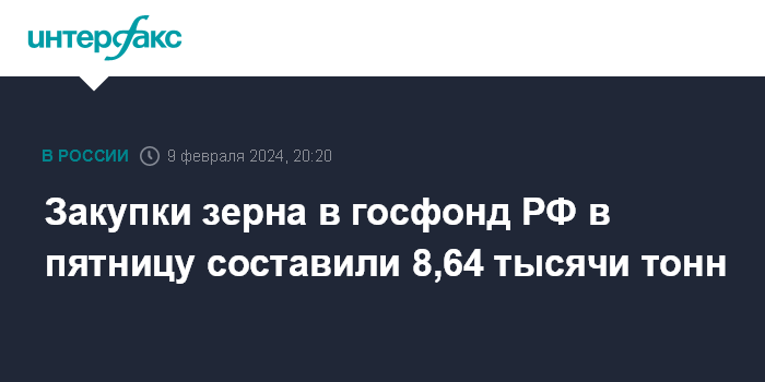 Закупки зерна в госфонд РФ в пятницу составили 8,64 тысячи тонн
