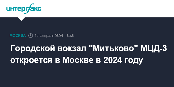 Москва. 10 февраля. INTERFAX.RU - Новый городской вокзал "Митьково" на третьей линии Московских центральных диаметров (МЦД-3) откроется в столице в 2024 году и будет расположен на границе районов Сокольники и Красносельского, сообщил мэр Москвы Сергей Собянин.
