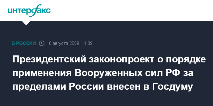 Сочи. 10 августа. INTERFAX.RU - Президент РФ Дмитрий Медведев внес в Госдуму законопроект о порядке применения Вооруженных сил РФ за пределами России. Глава государства сообщил об этом в понедельник на встрече с лидерами парламентских партий в Сочи.