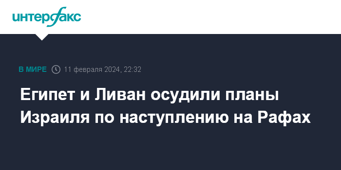 Москва. 11 февраля. INTERFAX.RU - Власти Ливана и Египта в воскресенье выступили против планов Израиля провести военную операцию в районе города Рафах в секторе Газа, сообщают ближневосточные и арабские СМИ.