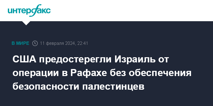 Москва. 11 февраля. INTERFAX.RU - Президент США Джо Байден в воскресенье в ходе телефонного разговора с израильским премьером Биньямином Нетаньяху заявил, что Израиль не должен проводить военную операцию в Рафахе в секторе Газа, пока не обеспечит безопасность находящихся там палестинцев, сообщили в Белом доме.