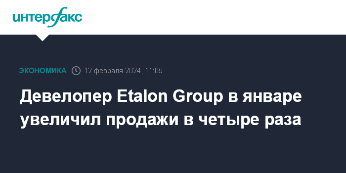 Москва. 12 февраля. INTERFAX.RU - Девелопер Etalon Group в январе 2024 года увеличил продажи в четыре раза по сравнению с аналогичным периодом прошлого года - до 12,5 млрд рублей, говорится в сообщении компании.