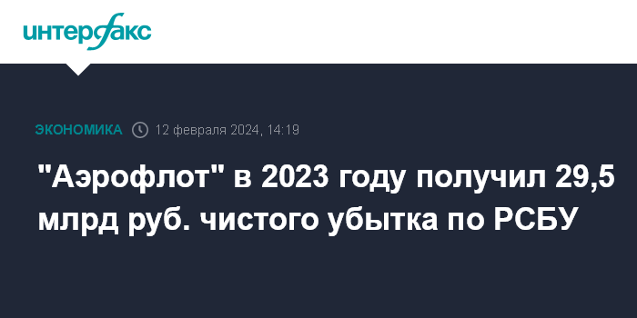 Москва. 12 февраля. INTERFAX.RU - Чистый убыток "Аэрофлота" по РСБУ в 2023 году составил 29,5 млрд руб. против убытка в 14,3 млрд руб. за 2022 год, сообщила компания.