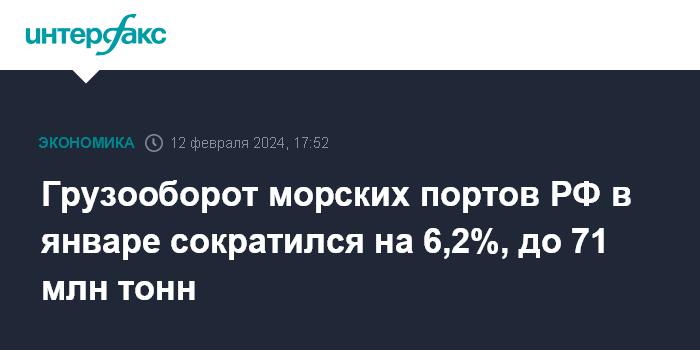 Москва. 12 февраля. INTERFAX.RU - Грузооборот морских портов РФ в январе 2024 года уменьшился на 6,2% по сравнению с аналогичным периодом 2023 года и составил 71 млн тонн, сообщило Федеральное агентство морского и речного транспорта (Росморречфлот).