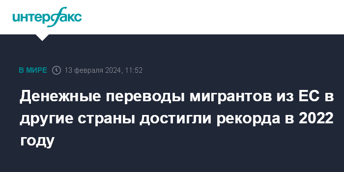 Москва. 13 февраля. INTERFAX.RU - Объем денежных переводов, отправляемых мигрантами из Евросоюза в свои страны, постоянно увеличивался с 2014 года и в 2022 году достиг рекордных 43,5 млрд евро, сообщило статистическое управление ЕС (Eurostat).