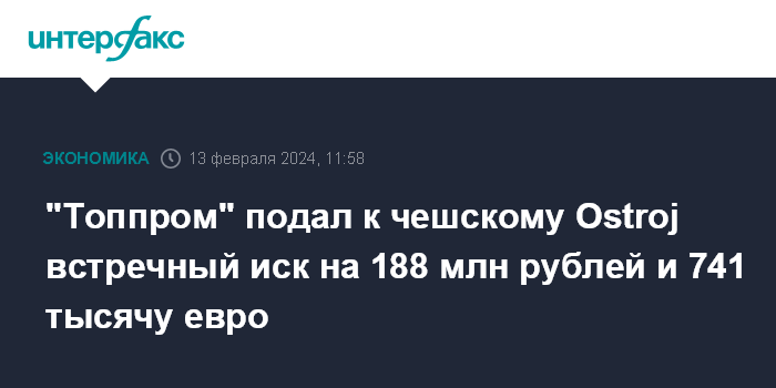 "Топпром" подал к чешскому Ostroj встречный иск на 188 млн рублей и 741 тысячу евро
