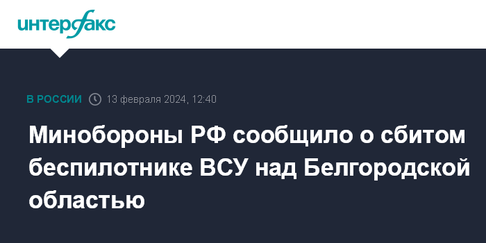 Москва. 13 февраля. INTERFAX.RU - Российские военные сообщили, что пресекли украинскую атаку с применением беспилотника самолетного типа по объектам на территории Российской Федерации.