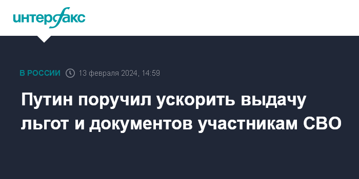 Москва. 13 февраля. INTERFAX.RU - Президент РФ Владимир Путин поручил правительству представить предложения по ускорению процесса выдачи льгот, документов и выплат участникам специальной военной операции (СВО), сообщает сайт Кремля.