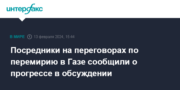 Москва. 13 февраля. INTERFAX.RU - Посредники в переговорном процессе Израиля и движения ХАМАС добились прогресса в ходе обсуждения плана по перемирию в секторе Газа, сообщает агентство Associated Press со ссылкой на два осведомленных источника.