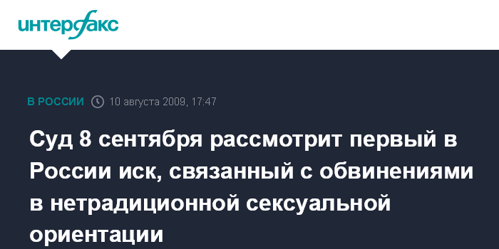 Москва. 10 августа. INTERFAX.RU - Савеловский суд Москвы назначил на 8 сентября рассмотрение первого в России иска о защите чести и достоинства в связи с распространением информации о нетрадиционной сексуальной ориентации истца.