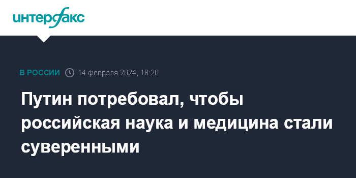Москва. 14 февраля. INTERFAX.RU - Российская наука и медицина должны быть суверенными, чтобы быть готовыми к любым вызовам, включая угрозы новых эпидемий, заявил на Форуме будущих технологий президент Владимир Путин.
