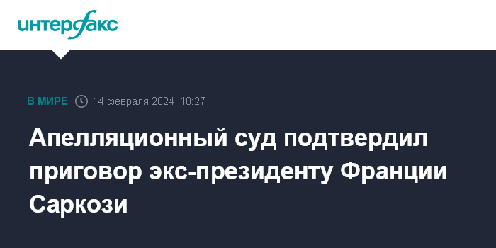 Москва. 14 февраля. INTERFAX.RU - Апелляционный суд Парижа подтвердил приговор бывшему президенту Франции Николя Саркози по делу о незаконном финансировании президентской избирательной кампании, сообщила в среду газета Le Figaro.
