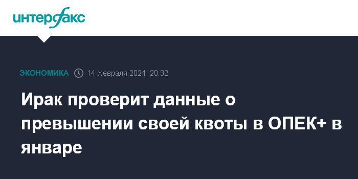 Москва. 14 февраля. INTERFAX.RU - Ирак проверит данные о превышении им своей квоты в рамках ОПЕК+ в январе, в случае их подтверждения намерен компенсировать объемы в течение последующих четырех месяцев, заявило Министерство нефти страны.