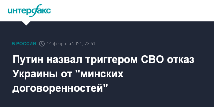 Москва. 14 февраля. INTERFAX.RU - Триггером для начала специальной военной операции на Украине стал отказ Киева от выполнения "минских договоренностей" и удары по Донбассу, заявил президент РФ Владимир Путин.