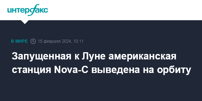 Москва. 15 февраля. INTERFAX.RU - Автоматическая межпланетная станция Nova-C техасской компании Intuitive Machines, стартовавшая в четверг к Луне, успешно выведена орбиту, сообщило NASA.