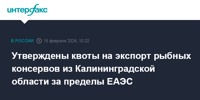 Москва. 15 февраля. INTERFAX.RU - Правительство установило тарифные квоты на беспошлинный вывоз рыбных консервов и консервированных морепродуктов из Калининградской области за пределы ЕАЭС, сообщает сайт правительства.