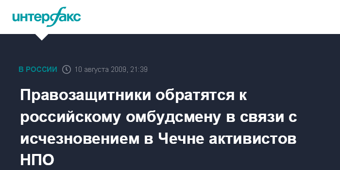 Москва. 10 августа. INTERFAX.RU - Глава старейшей в России правозащитной организации Московской Хельсинкской группы Людмила Алексеева готовит обращение к уполномоченному по правам человека в РФ в связи с похищением неизвестными в Чечне двух активистов местной правозащитной организации "Спасем поколение".