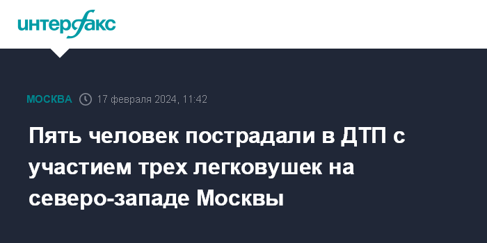Москва. 17 февраля. INTERFAX.RU - Авария с участием трех автомобилей произошла на северо-западе Москвы, пять человек пострадали, сообщили в субботу в пресс-службе столичного управления Госавтоинспекции.