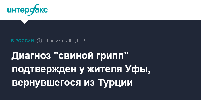 Москва. 11 августа. INTERFAX.RU - В Уфе (Башкирия) у одного из госпитализированных с подозрением на заболеванием гриппом А/Н1N1 подтвержден диагноз. Как сообщили агентству "Интерфакс-Поволжье" в управлении Роспотребнадзора по Башкирии, носителем вируса гриппа А/Н1N1 стал житель Башкирии 1993 г.р., отдыхавший с отцом в турецком городе Мармарис. Он был доставлен 30 июля с борта самолета в уфимскую инфекционную больницу и был выписан 7 августа после клинического выздоровления. Диагноз подтвержден по результатам лабораторных исследований, проведенных в Центральном НИИ эпидемиологии Роспотребнадзора, уточнил собеседник агентства.